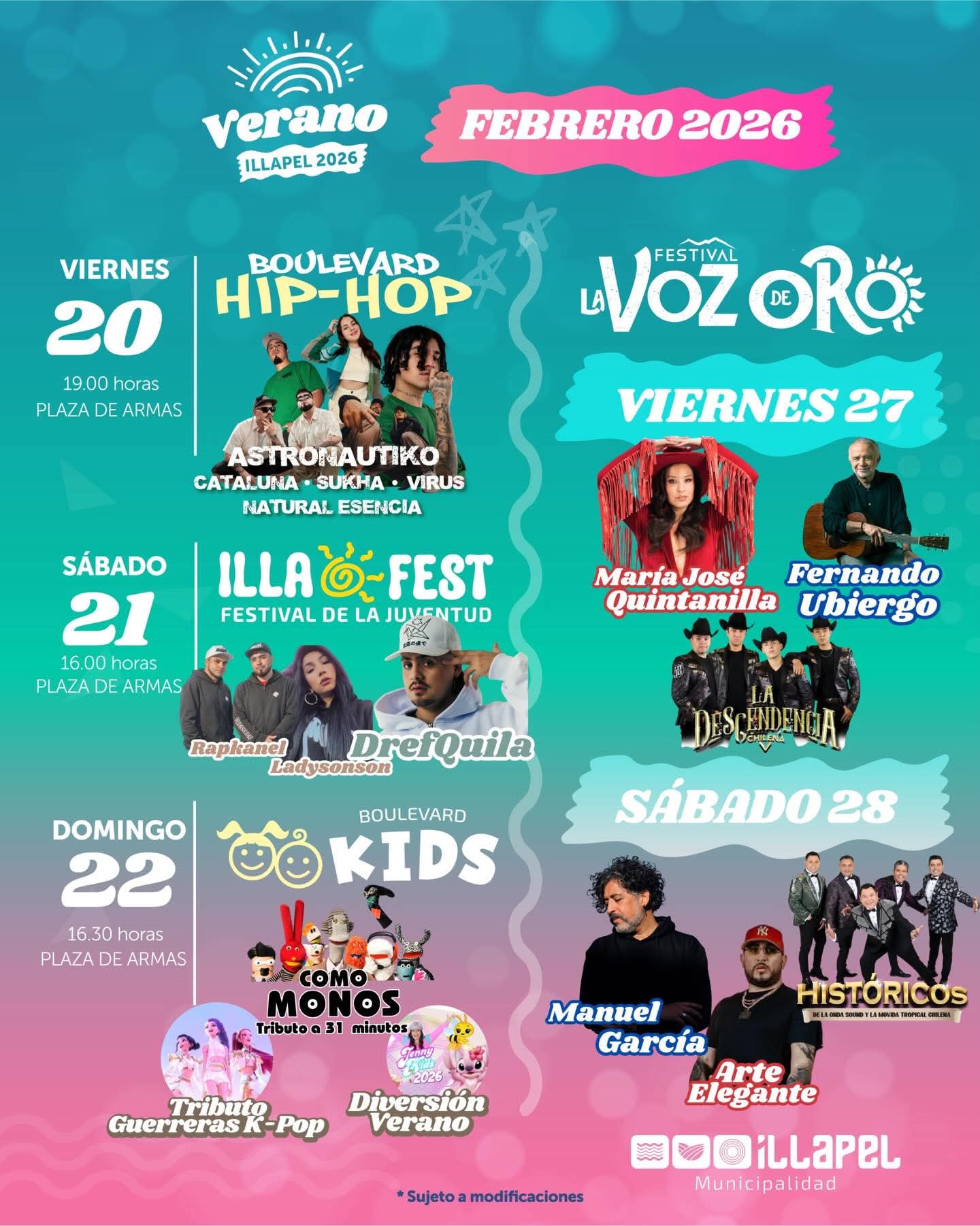 Este Miércoles 25 de Febrero, se realizó una visita a la plaza de abastos de Illapel, lugar donde se desarrollará el Festival de la canción La Voz de Oro, este Viernes 27 de Febrero dobde se presentará Maria Jose Quintanilla, Fernando Ubiergo y la Descendencia Chilena, mientras que el Sábado 28, estarán actuando Manuel Garcia, Arte Elegante y Los Historicos del Sound.
